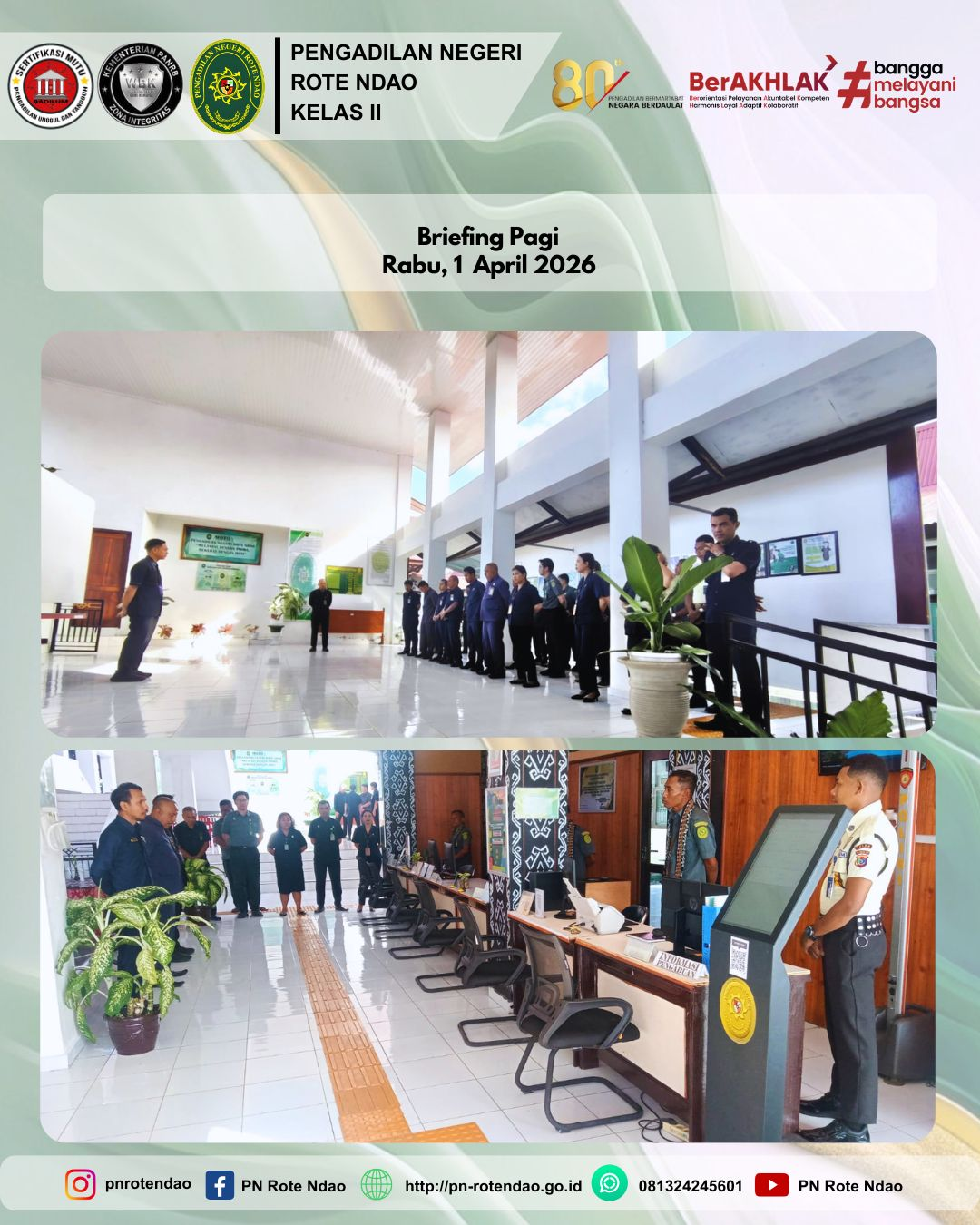 Pada hari Rabu, 1 April 2026, bertempat di Lobby Pengadilan Negeri Rote Ndao diadakan kegiatan doa bersama, program semangat pagi, kegiatan briefing PTSP, Kepaniteraan dan Kesekretariatan yang dipimpin oleh Hakim Pengadilan Negeri Rote Ndao, Aditria Langlang Buana, S.H., M.H. dan diikuti oleh Para Hakim, Panitera, Sekretaris, Pejabat Struktural & Fungsional, Pelaksana serta PPPK Pengadilan Negeri Rote Ndao.