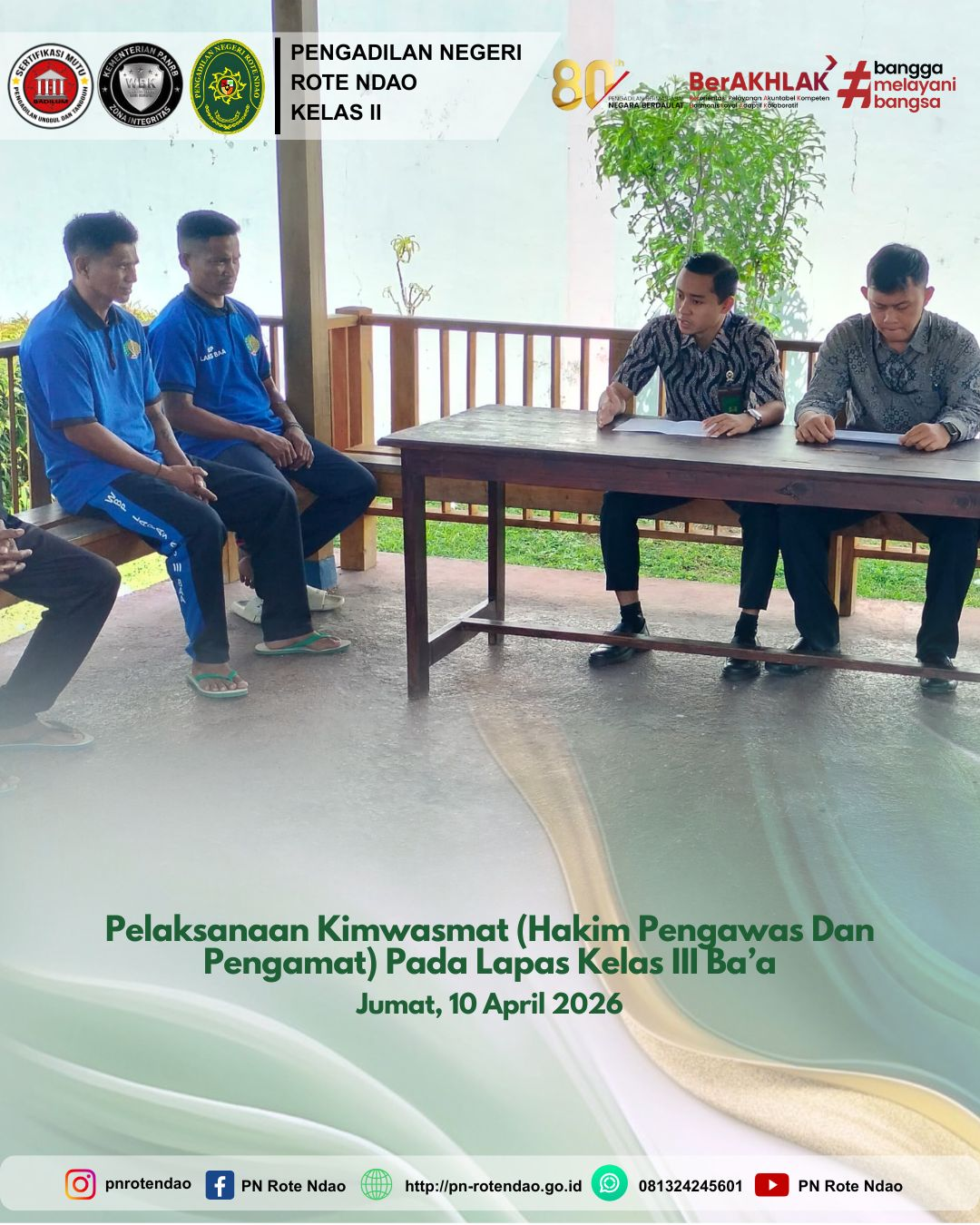 PN ROTE NDAO - HUMAS : Pada hari Jumat, 10 April 2026, Pengawasan dan Pengamatan di Lembaga Pemasyarakatan Kelas III Ba’a oleh Hakim Pengawasan dan Pengamatan (Kimwasmat) PN Rote Ndao, Bapak Felix Aldi Anggoro Jati, S.H., M.H. dan Bapak Daniel Kevin Octovianus Tallo, S.H., M.H. didampingi Bagian Kepaniteraan Pidana, Bapak Almi Ambiya Muhammad Lubis, S.H., M.H., Analis Perkara Peradilan, Bapak David Christian, S.H.