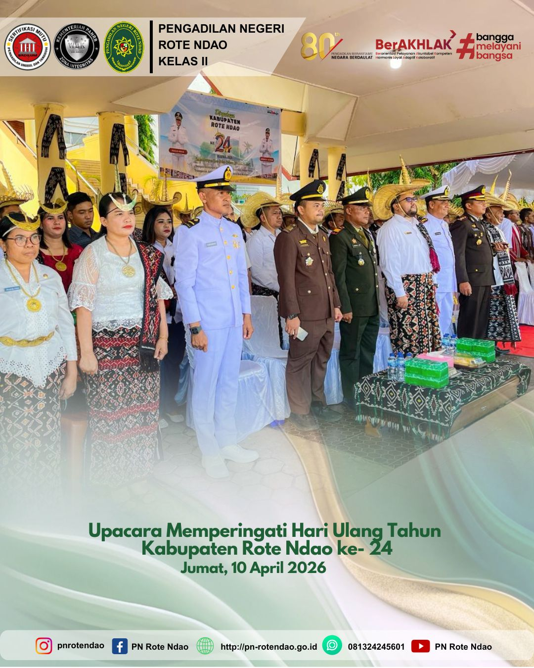 Pada hari Jumat, 10 April 2026, Ketua Pengadilan Negeri Rote Ndao yang diwakilkan oleh Bapak Muhammad Kafri Pratama, S.H. sebagai Hakim Pengadilan Negeri Rote Ndao bersama Panitera Alfonsus Hoinbala, S.H. dan Sekretaris Bapak Riset Djami, S.Kom., S.H. mengikuti undangan Upacara dan Syukuran Memperingati Hari Ulang Tahun Kabupaten Rote Ndao ke 24. Undangan kegiatan ini dihadiri oleh segenap Pejabat Daerah Kabupaten Rote Ndao dan Pimpinan Forkopimda.